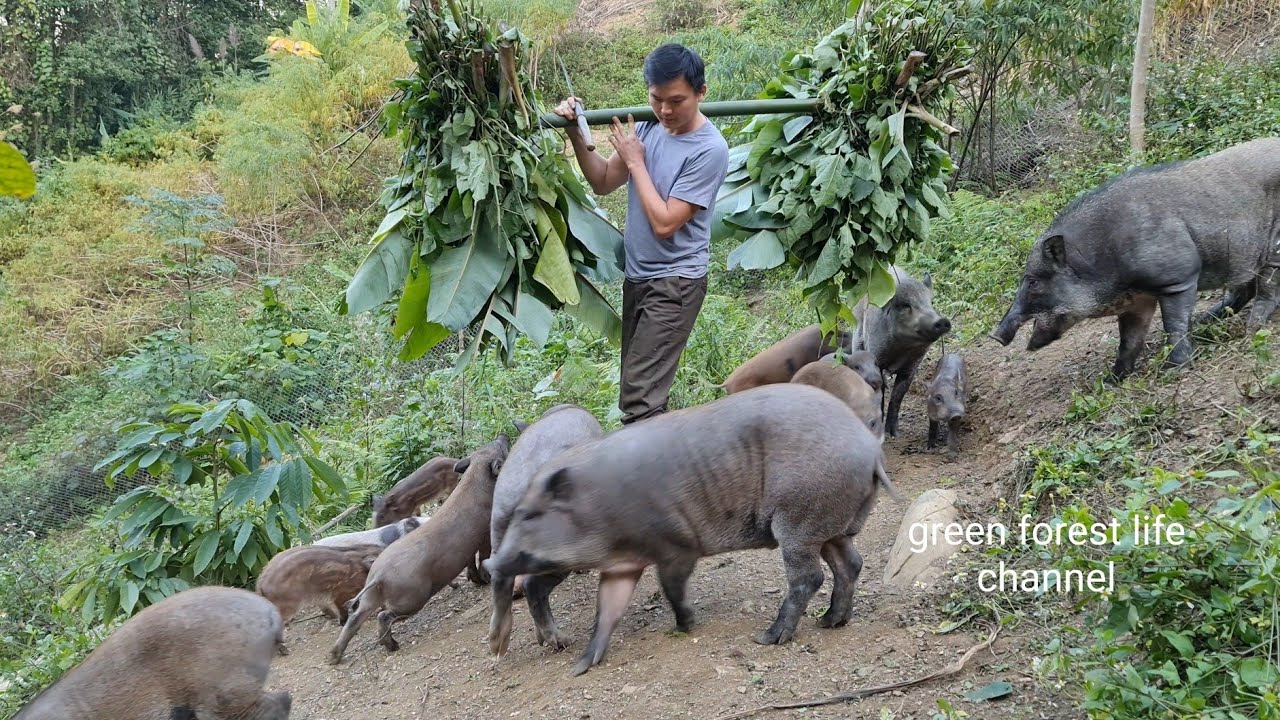 Vegetable, grass and corn party for wild boar. A busy day with wild boar.#greenforestlife #greenforestlifechannel #robert #wildboar#raisewildboar